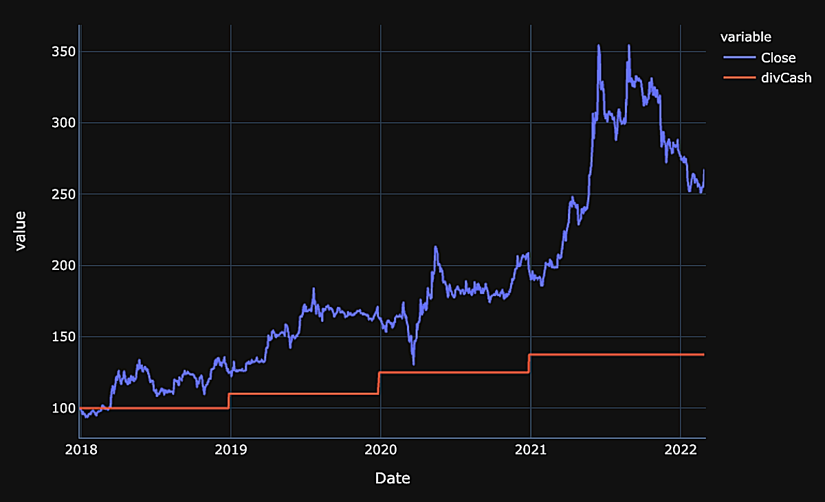 고려신용정보의 배당금액과 주가흐름을 비교해 보았다. 2017년12월28일의 주가와 배당금액을 100으로 놓고 이후 추이를 비교해보았다. 21년 이후에 크게 상승한 것이 눈에 띈다. 최근에 미국 테이퍼링과 금리인상, 국제 정세 등의 이슈로 주가가 많이 하락했다. 파란색은 종가, 붉은색은 배당금이다. 배당금이 꾸준히 상승하는 모습이 인상적이다.