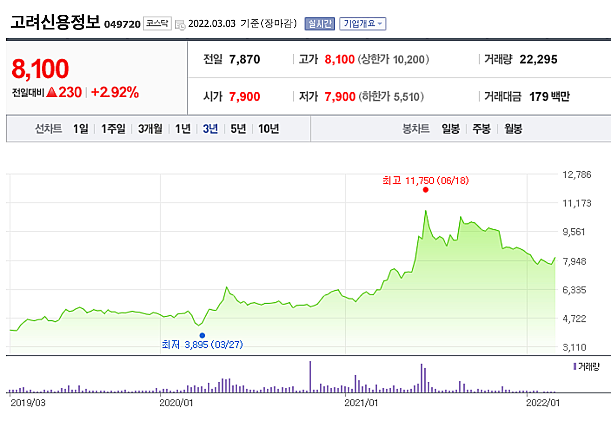 고려신용정보의 종목코드는 049720이다. 코로나 이후에 주가가 많이 상승하였다.