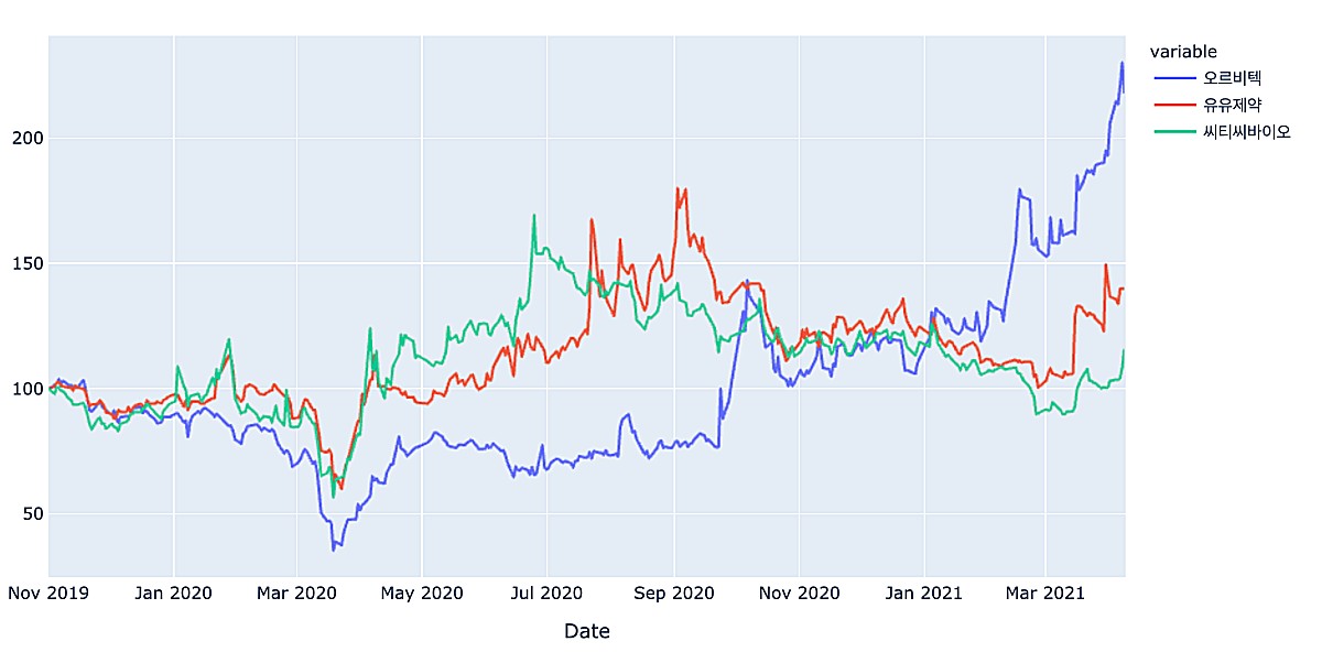 21년4월9일 기준으로 위 3개 기업의 주가를 비교해 보았다. 19년 11월 1일 주가를 100으로 놓고 이후 변화를 알아보았다.