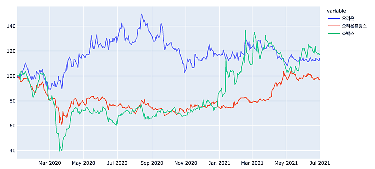 오리온, 오리온홀딩스, 쇼박스의 주가를 비교해보았다. 가격이 달라 2020년 1월2일을 100으로 놓고, 등락이 어떻게 되는지 살펴보았다.