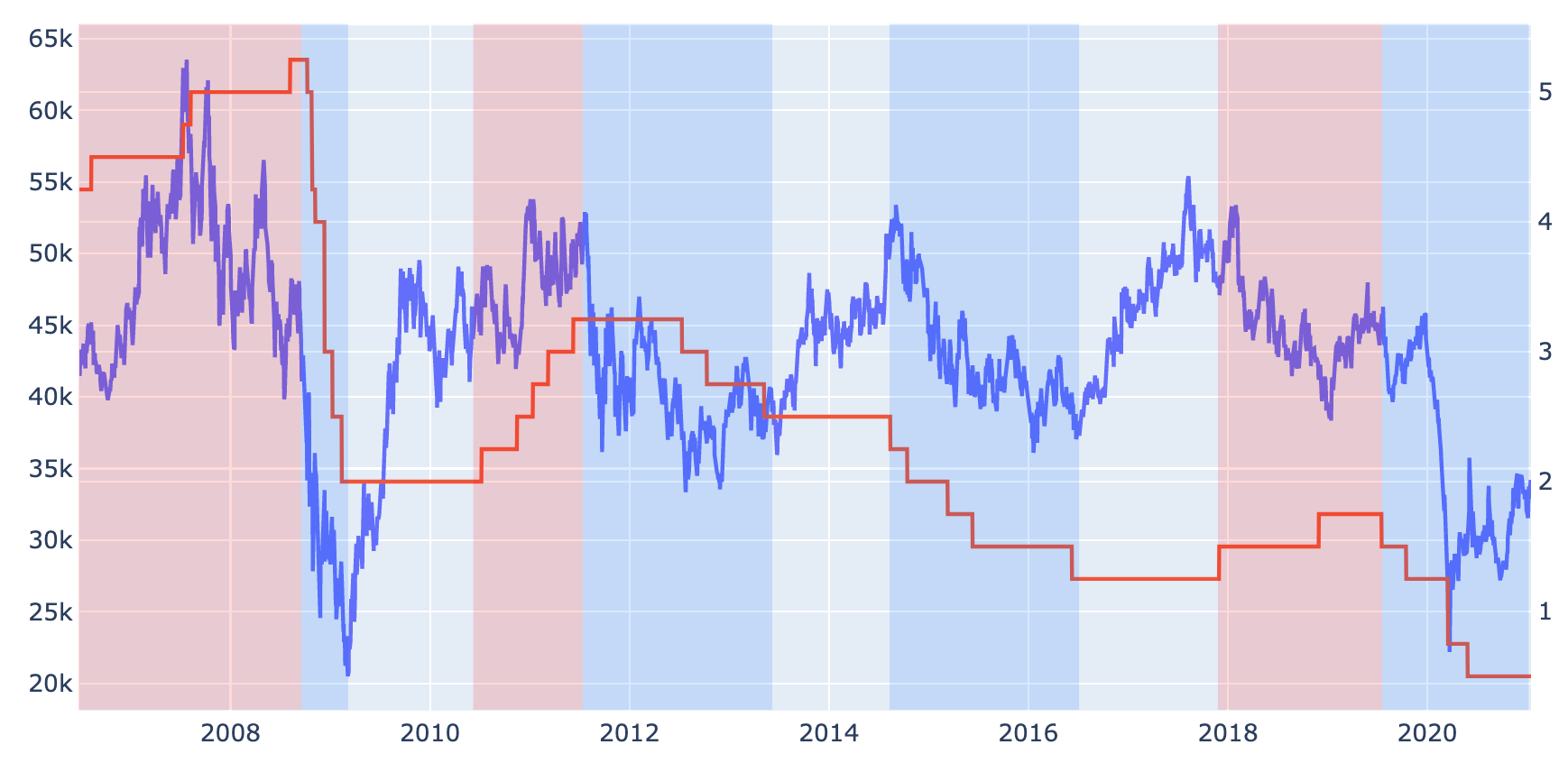 파란색 선은 은행주ETF의 가격을, 빨간색 선은 기준금리의 변화를 나타낸다. 왼쪽의 Y축이 은행주ETF 가격, 오른쪽 Y축이 기준금리 값이다. 금리가 상승하는 시기는 빨간색 마스크를, 금리가 하락하는 시기에는 파란색 마스크를 씌워 보았다. 금리가 상승하는 시기에는 예대마진이 커지니 주가가 올라갈 것 같지만 실제로는 그렇지 않았다. 오히려 금리가 상승하는 시기에는 주가가 주춤하거나 오히려 하락하는 것을 알 수 있었다. 금리가 하락하는 시기에는 경기 부양책이 많이 시행되는 시기여서 그런지,은행주의 주가도 상승하는 것을 알 수 있었다.