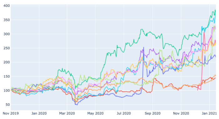 위에서부터 녹색이 에코프로비엠, 하늘색이 엘앤에프, 보라색이 LG화학, 분홍색이 삼성SDI, 연두색이 뉴인텍, 다홍색이 명신산업, 오렌지색이 코스모신소재, 파란색이 알루코, 주황색이 일진머티리얼즈, 빨간색이 후성이다. 전기차 배터리 소재 관련해서 에코프로비엠과 엘앤에프의 주가 상승폭이 가장 컸다. LG화학은 20년 8월쯤에 주가가 크게 상승한 이후에, 삼성SDI가 20년 12월부터 상승하여 현재는 2종목의 상승폭이 비슷해졌다. 일진머티리얼즈와 후성은 전기차 관련주임에도 불구하고, 많이 상승하지는 못했다. 하지만, 상기 2개 기업을 제외하고는 대부분 주가가 50%이상 상승한 것을 알 수 있따.