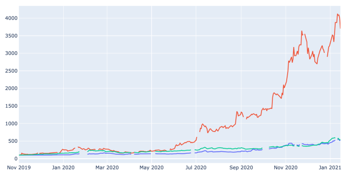 붉은색이 니오, 녹색이 CATL, 파란색이 비야디이다. 니오는 테슬라가 부럽지 않은 주가 상승이 일어났다. CATL과 비야디도 코로나 이전 시점에 비교하여 약 500% 정도 상승하였지만, 니오와 비교가 불가하다. 어떤 이유로 이렇게 큰 폭으로 상승하였는지는 모르겠지만, 전기차가 얼마나 각광을 받고 있는지는 짐작이 가능하다.