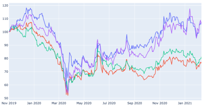 코로나 이후에 은행주들의 주가를 비교해 보았다. 19년 11월 1일의 주가를 100으로 놓고, 이후 주가 흐름을 비교해보았다.