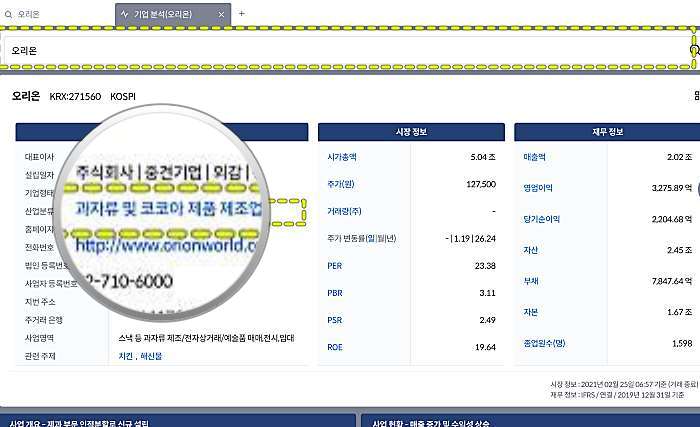 일단 오리온을 검색해보자. '과자류 및 코코아 제품 제조업'에 속한다는 내용과 간략한 기업개요와 뉴스, 공시자료, 증권사 리포트, IR자료 등을 확인할 수 있다.