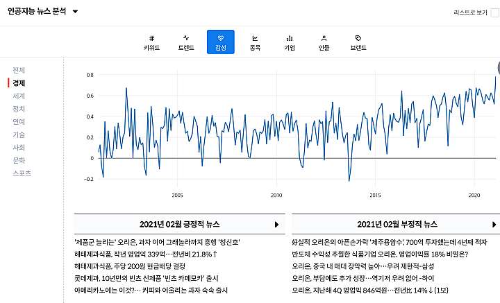 그 아래에는 뉴스를 키워드 별로 보여주는 화면이 있다. 전체로 보면 스포츠 관련 내용이 많아, 경제로 필터링 해 보았다. 다른 것보다 감성의 결과가 의외로 재미있었다. 최근에 오리온의 주가가 상승하였는데, 관련하여 긍정적인 뉴스가 많은 듯 하다. (추세선을 확인할 수 있으면 하는 아쉬움이 있다.) 감성지수와 주가의 선후 관계를 비교해 보는 것도 좋을 듯 하다.