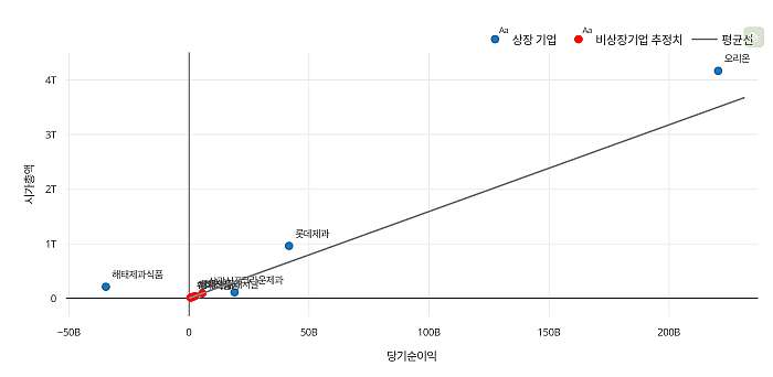 시가총액을 X축에, 당기순이익을 Y축에 놓고 그래프를 그리면, 오리온의 시가총액과 당기순이익이 모두 다른 기업들에 비해 압도적으로 높은 것을 확인할 수 있다.