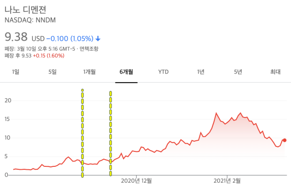 나노디멘션은 반도체를 3D 프린터로 만드는 기업이다. 자금 부족으로 유상증자를 여러 번 하였지만, 신기술에 대한 기대감으로 주가가 계속 상승하였다. 지금은 기술주에 대한 관심을 사그라들며 주가가 하락하였다.