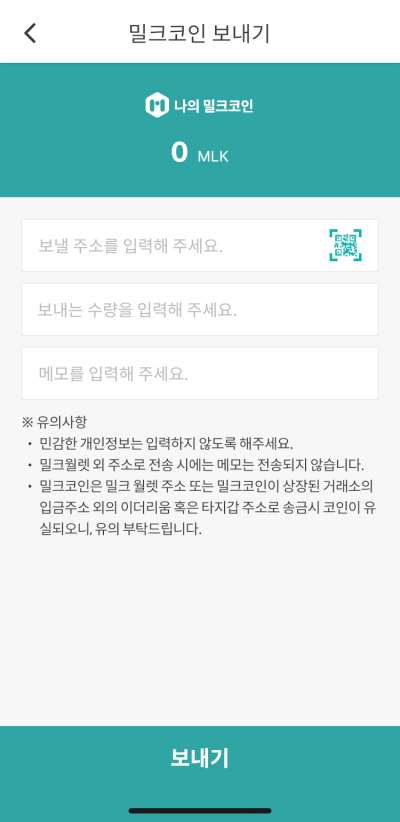 밀크앱에서 밀크코인 금액을 클릭하면 다음 화면에서 '보내기' 버튼을 확인할 수 있다. 보내기 버튼을 클릭한 후, 위에서 복사한 주소와 이동한 코인수량을 입력하면 업비트 계좌로 밀크코인을 보낼 수 있다.