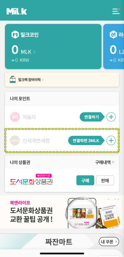 밀크 앱에 신세계 면세점 계정을 연결하면, 그 보상으로 3밀크코인을 받을 수 있다.