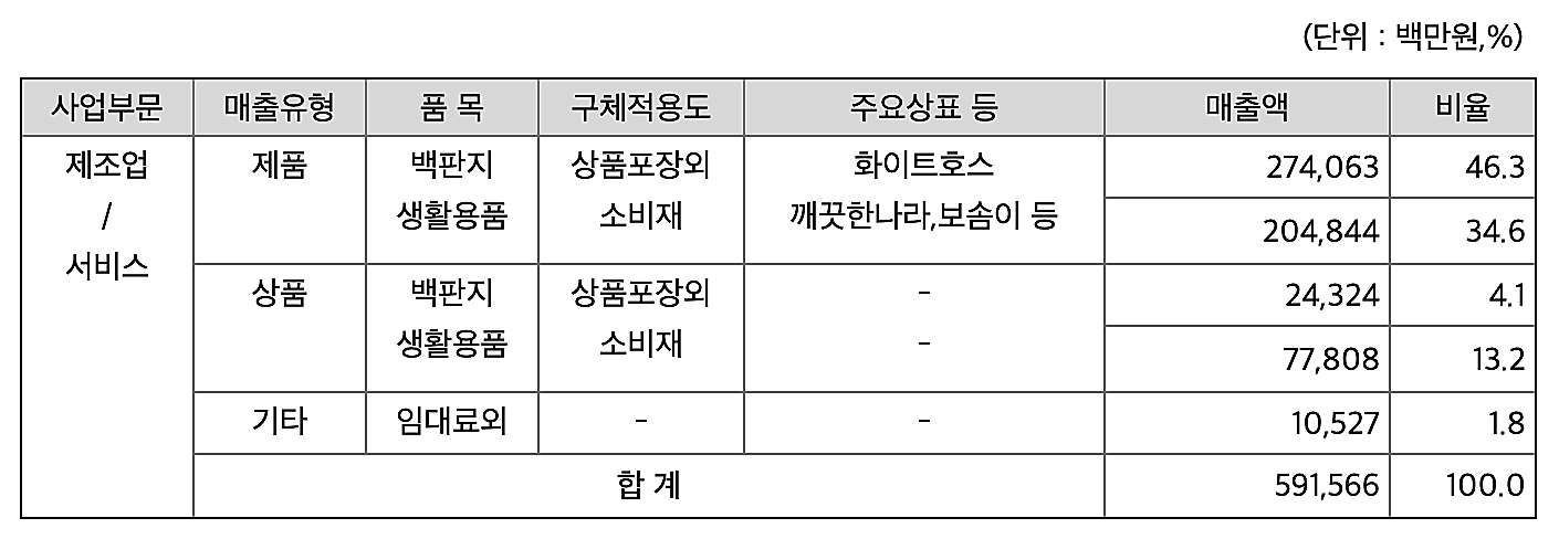 깨끗한나라는 종이 및 판지 제조업을 주사업으로 하고 있는 기업이다. 주요 브랜드는 깨끗한나라(화장지 및 미용티슈), 보솜이(기저귀), 순수한면(생리대), 봄날(성인용 기저귀) 등이 있다. 20년 2월 에는 마스크, 20년 4월 에는 손소독겔을 출시하며 사업영억을 넓히고 있다.