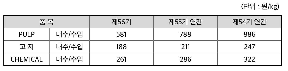 최근에 PULP를 비롯한 주요 원재료의 가격이 많이 하락하였다.