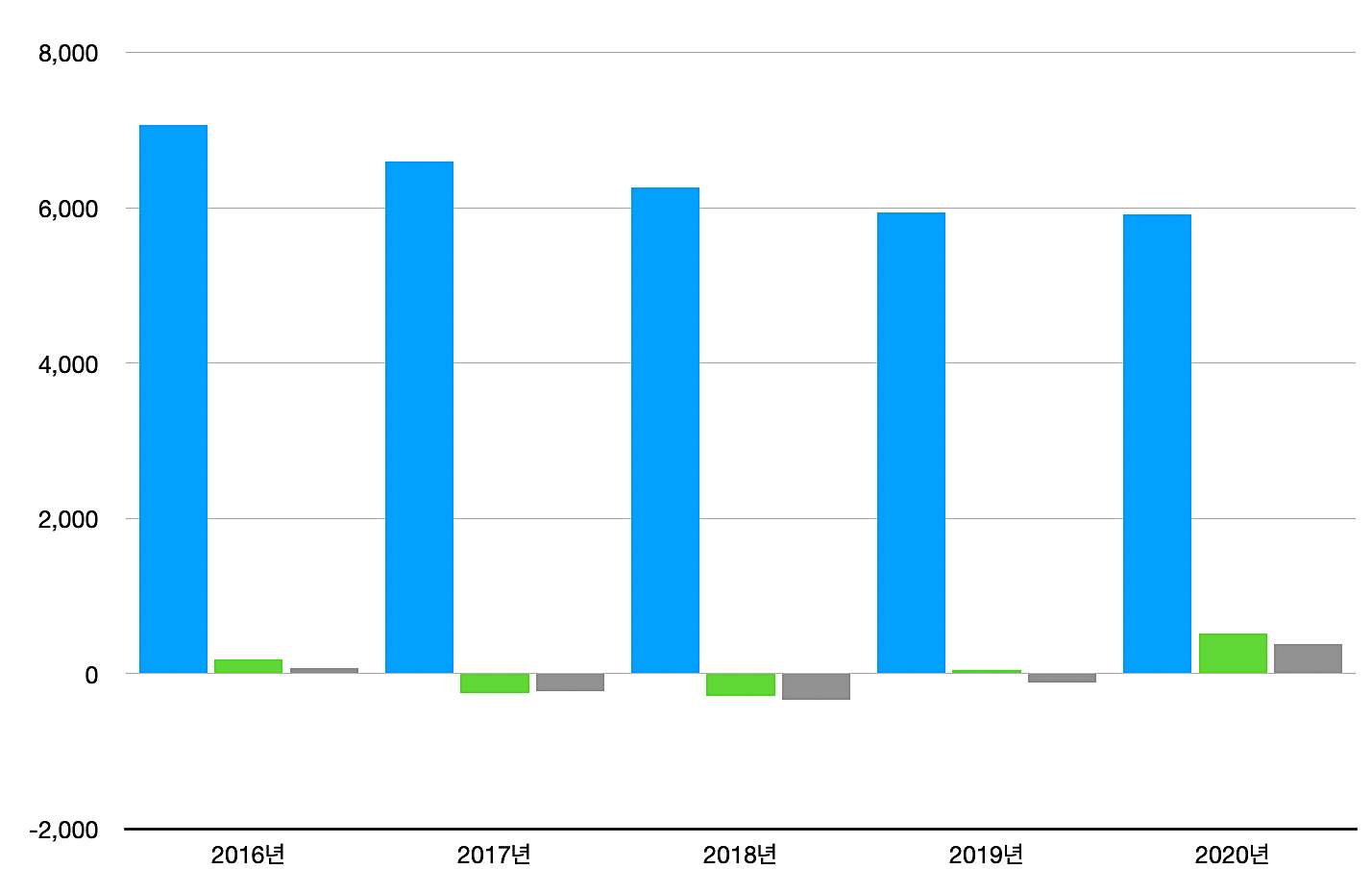 위의 그래프는 깨끗한나라의 연도별 매출액, 영업이익, 당기순이익을 나타내는 그래프이다. 파란색은 매출액, 녹색은 영업이익, 회색은 당기순익이다.