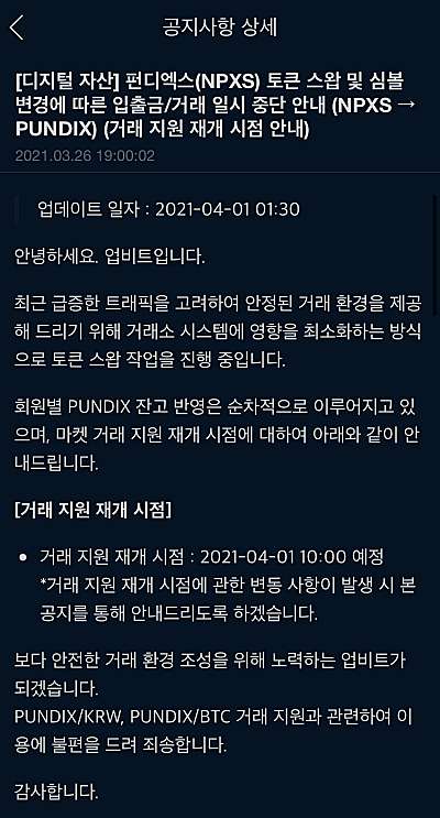 토큰스왑 일정은 거래소마도 조금 차이는 있는데, 3월 말이나 4월1일에 시작하는 듯 하다. 업비트의 경우 3월31일에 펀디엑스 코인의 거래를 중단하고, 이후에 PUNDIX로 거래 지원을 재개한다고 밝혔다. 최근에 4월1일 10시에 거래가 재개될 수 있도록 한다는 공지를 올렸다.
