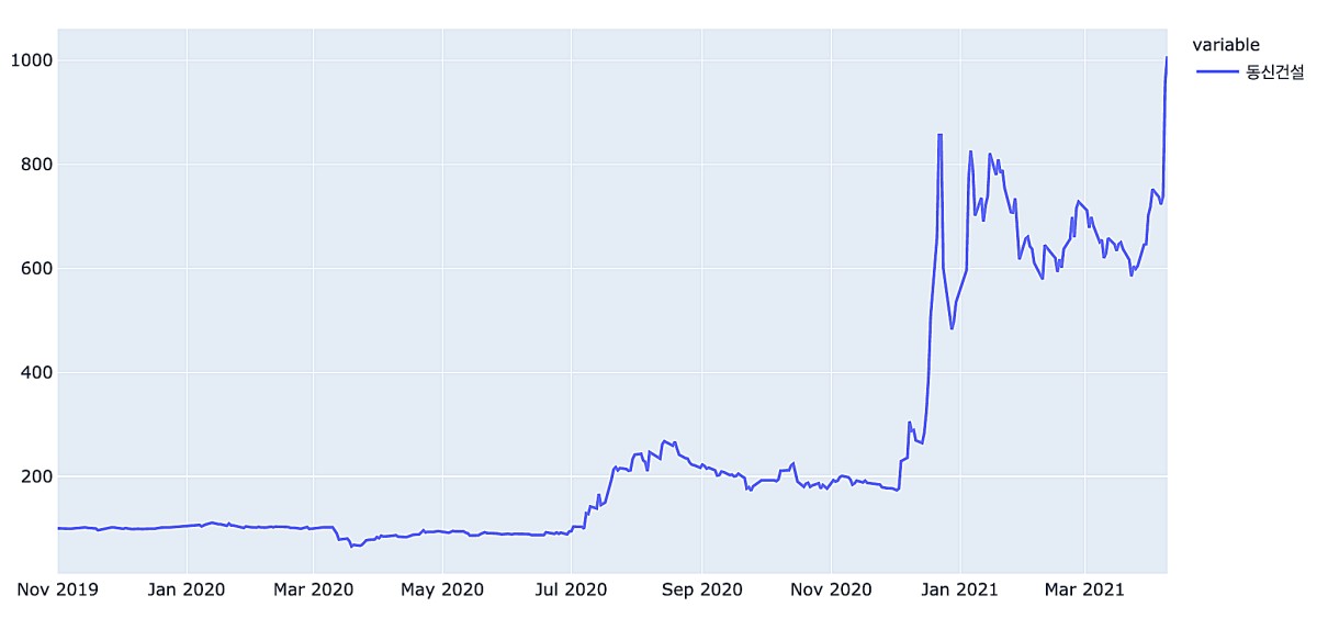 주가가 가장 많이 상승한 기업은 동신건설이었다. 19년 11월 1일 주가와 비교해서 1000%이상 상승하였다. 다른 관련주와는 차별화되는 내용 때문이 아닌가 싶다.