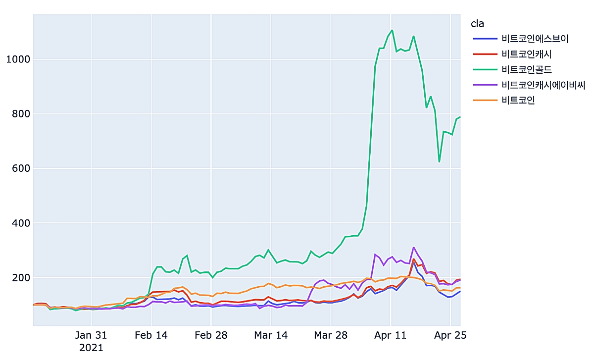 비트코인에서 하드포크된 다른 암호화폐들과 가격을 비교해보았다. 19년 11월 1일의 가격을 100으로 놓고, 이후 가격변화를 알아보았다.