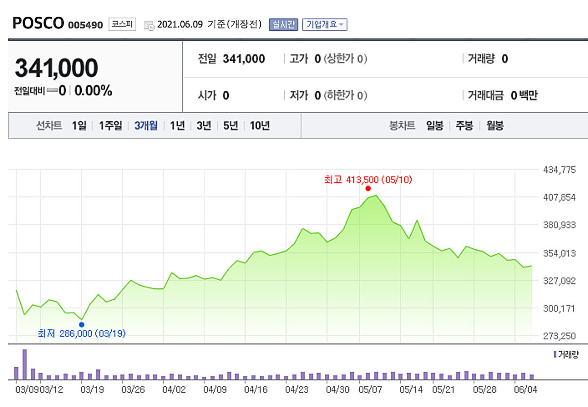 포스코 주가는 40만원을 넘어섰다가 최근에 조정을 받아서 34만원까지 하락하였다. 철강수요 증가와 철강가격의 추이가 향후 주가흐름을 결정하는데 중요한 포인트가 될 듯 하다.