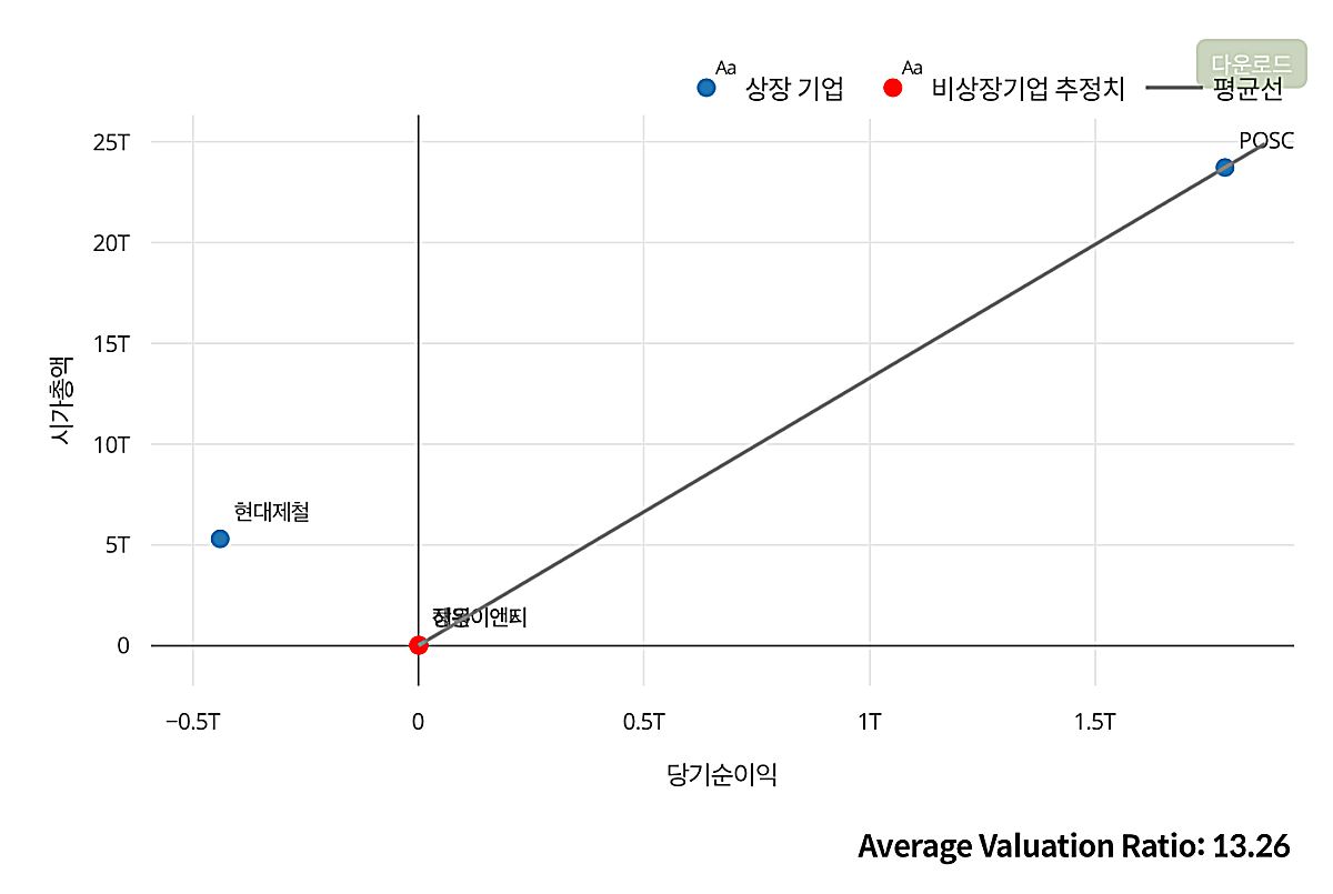 딥서치에서는 동종업계 비교도 가능하다. 제철업에 속한 기업의 당기순이익과 시가총액을 비교해보니 아래와 같다. 현대제철이 적자인 것이 눈에 띄고, 국내에 제철업에 속하는 기업이 별로 없기 때문에 포스코가 더 부각되는 듯 하다.