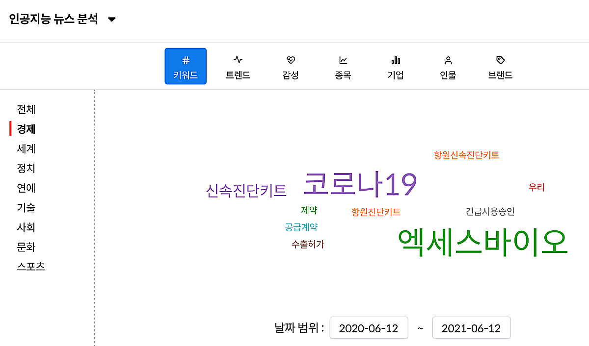 엑세스 바이오와 코로나 진단키트의 관계는 딥서치 인공지능 뉴스분석에서도 확인할 수 있다. 대부분의 키워드가 코로나 진단키트와 관련된 키워드이다.