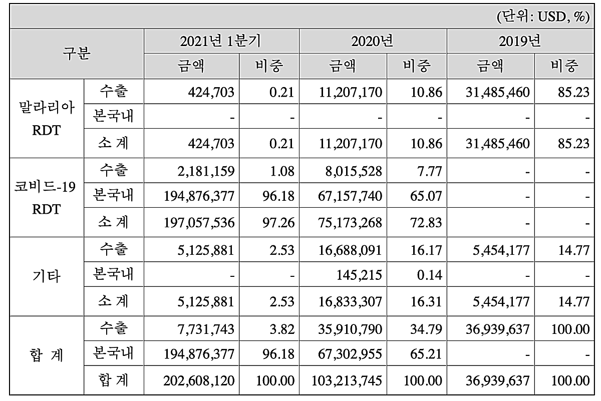 이는 이미 짐작했겠지만 코로나 진단 시약의 역할이 크다. 재미있는 것은 말라리아 진단시약이다. 그 전에 회사의 주력제품인데 지금은 기타보다 매출이 적다. 기타가 무엇을 의미하는지 궁금했지만 알기는 어려웠다.