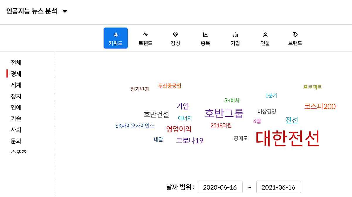 딥서치에서는 '인공지능 뉴스분석'이라고 하여, 뉴스에서 가장 많이 연관돼서 나오는 키워드를 보여주는 서비스가 있다. 해당 내용을 살펴보면 아래와 같다.
