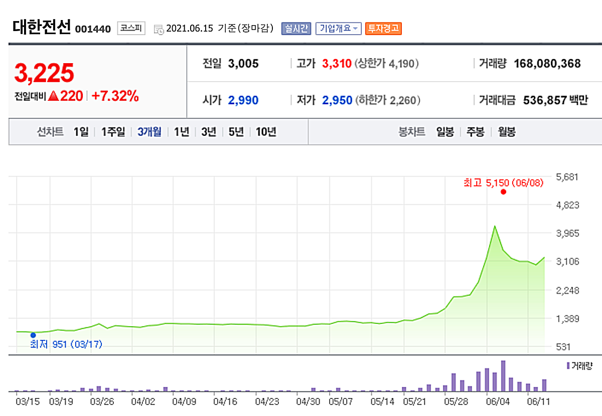 대한전선의 주가는 5,150원 최고가를 찍은 후에 3000원대까지 주가가 조정된 모습이다. 현재는 3000원대에서 횡보하는 모습을 보여주고 있다.