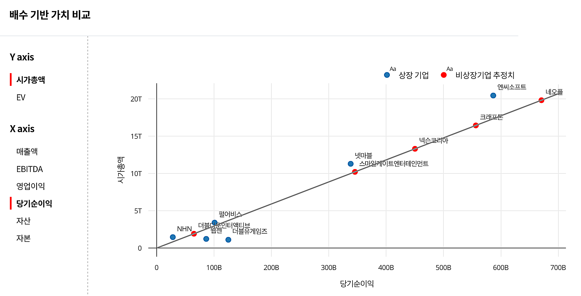 딥서치를 이용해서 다른 게임산업들과 비교해보았다. 매출액을 비교해보니 웹젠은 너무 작아서 보이지 않는다. 넷마블, 엔씨소프트, 넥슨, NHN 크래프톤 순임을 확인할 수 있었다.