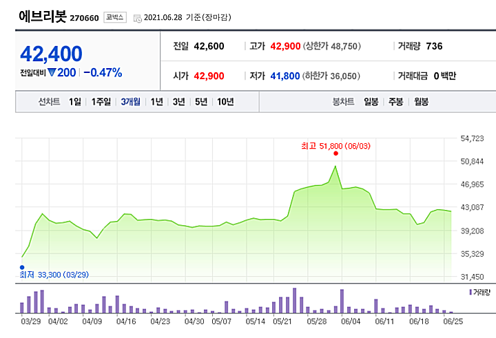 에브리봇은 현재 코넥스 시장에 상장되어 있다. 현재는 4만원대 초반에 가격이 형성되어 있다.