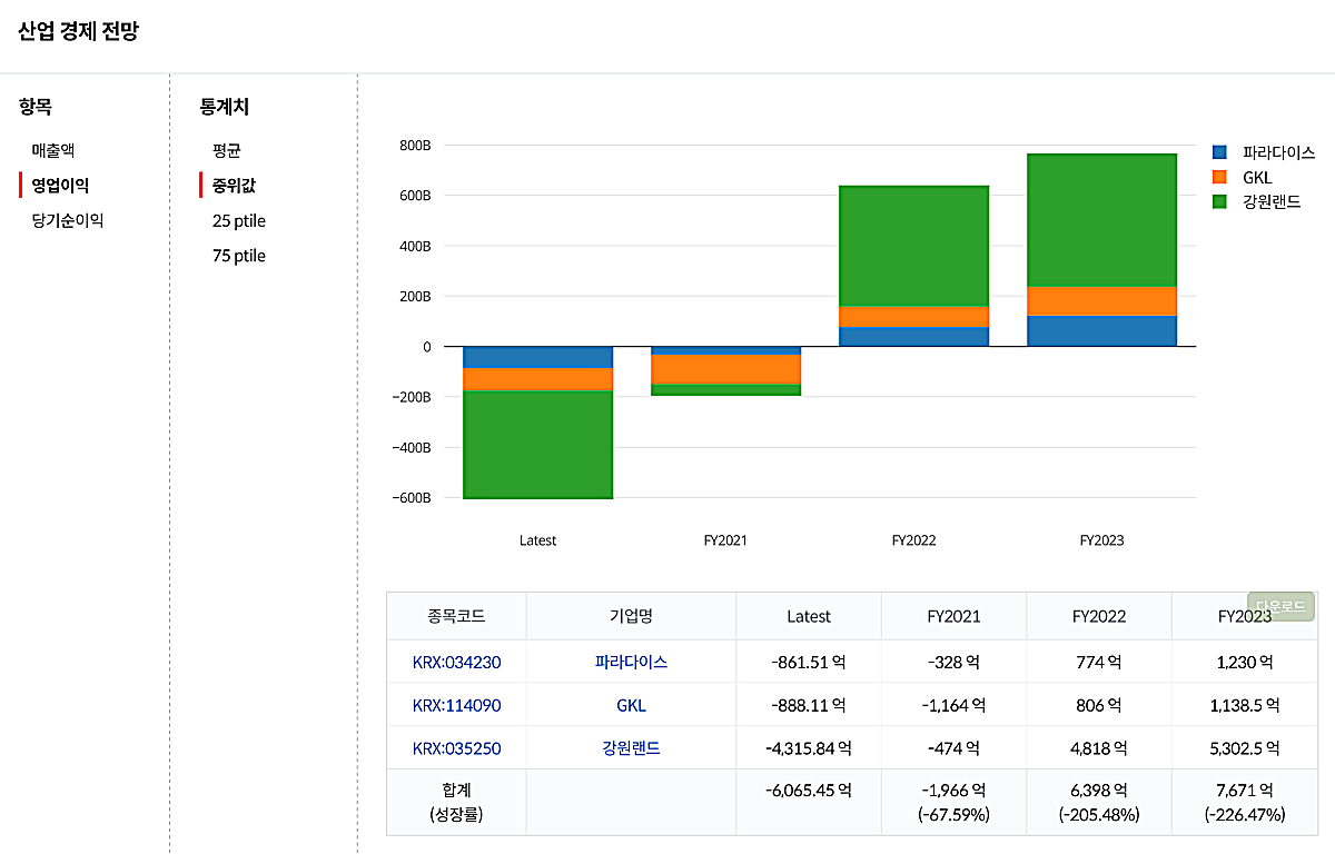 딥서치의 '산업경제전망'항목을 확인하면 향후 전망치도 확인할 수 있는데, 강원랜드가 다른 기업에 비해 압도적으로 빨리 벗아날 것이라고 기대하는 듯 하다.