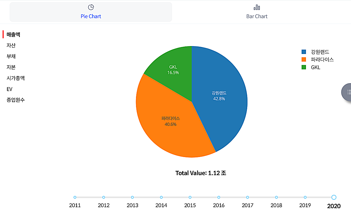 연도별 배출액을 비교해보면, 당연한 애기지만 2020년에 매출액이 크게 감소한 것을 확인할 수 있다. 가장 매출액이 많이 감소한 기업은 강원랜드이다. 파라다이스와 GKL은 반토막 수준으로 떨어졌는데, 강원랜드는 전년도에 비해 70%정도 매출이 감소한 것을 확인할 수 있다.