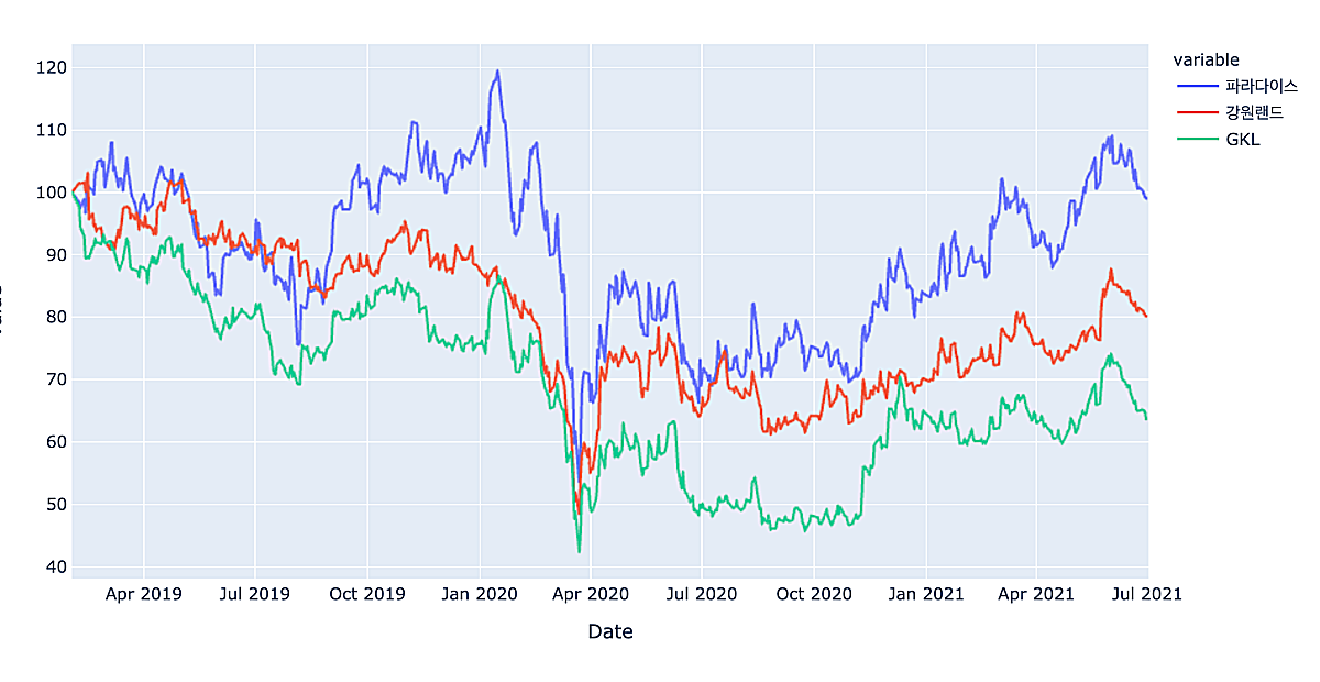 카지노 주식 3곳의 주식가격 추이를 비교해보았다. 19년 2월 1일의 가격을 100으로 놓고, 이후 주가의 흐름을 비교해보았다. 코로나 이후에 가격 흐름은 3곳이 비슷하게 보인다. 다만, 강원랜드가 더 빨리 살아날 것이라는 기대감은 반영되고 있지 않나 싶다.