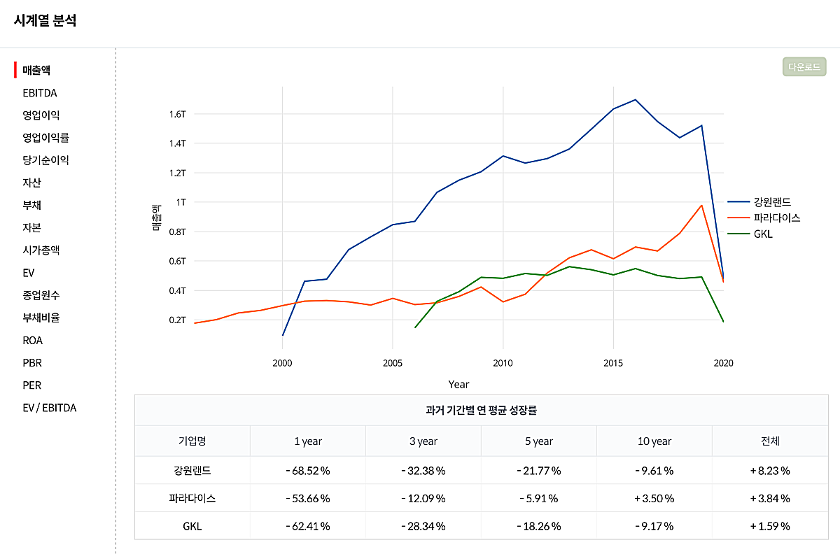 먼저 3곳의 2020년 매출액을 비교해보았다. 생각보다 파라다이스의 매출액이 높은 것이 의외였다. 아무래도 리조트를 보유하고 있어, 여기서 나오는 매출액의 비중이 적지 않은 듯 하다.