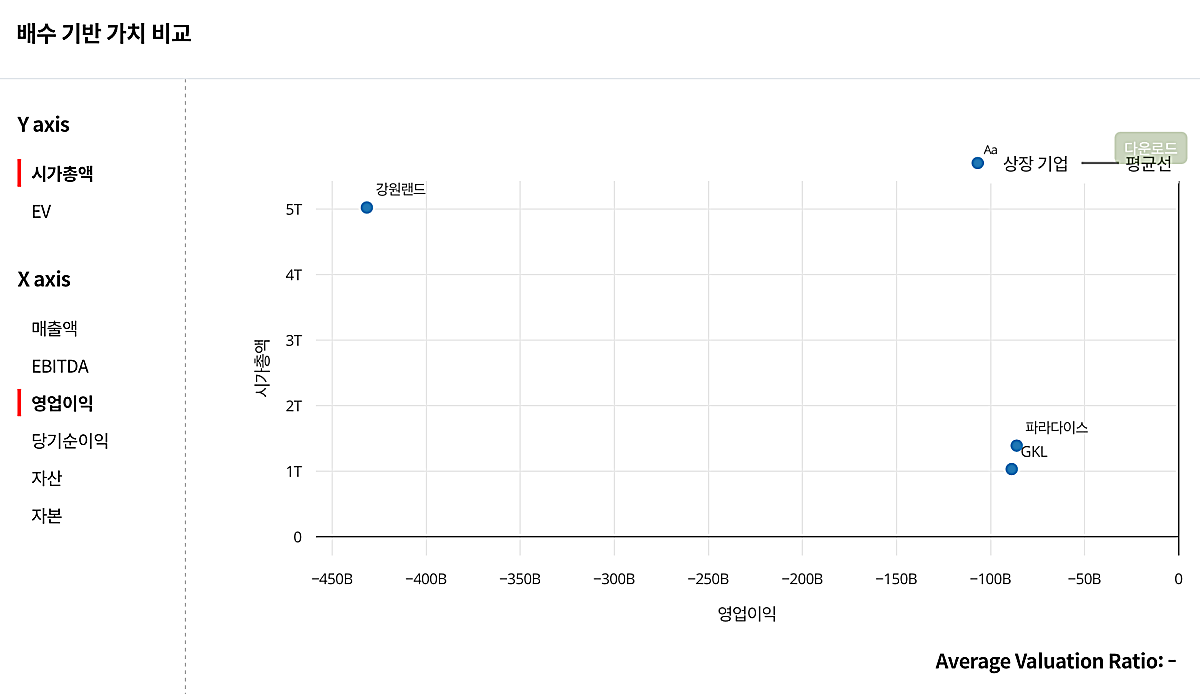 딥서치의 사업분석 메뉴를 이용하면 산업분류나 기업집단, 주제 등을 기준으로 기업을 비교할 수 있다. 위의 카지노 주식 3곳을 선택하여 비교해보았다.