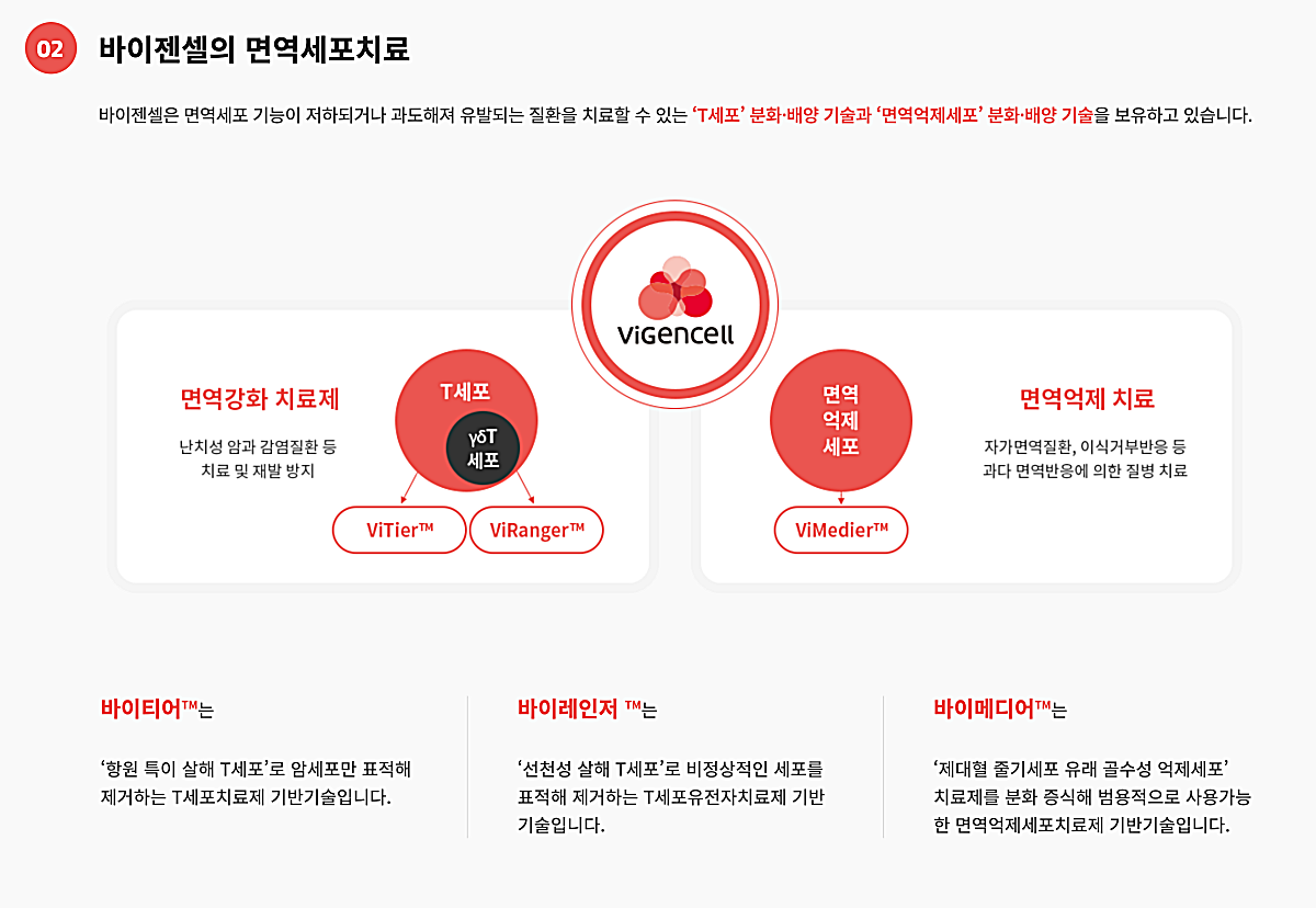 바이레인저는 감마델타T세포를 활용한 기술로 동종으로 사용할 수 있는 유용한 세포라고 한다. 바이메디어는 면역기능을 억제해주는 제대혈 유래 골수성 억제세포(CBMS) 기반의 기술이라고 한다. 바이메디어 기술을 접목해 아토피피부염과 이식편대숙주질환 치료제 2개도 개발하고 있다.