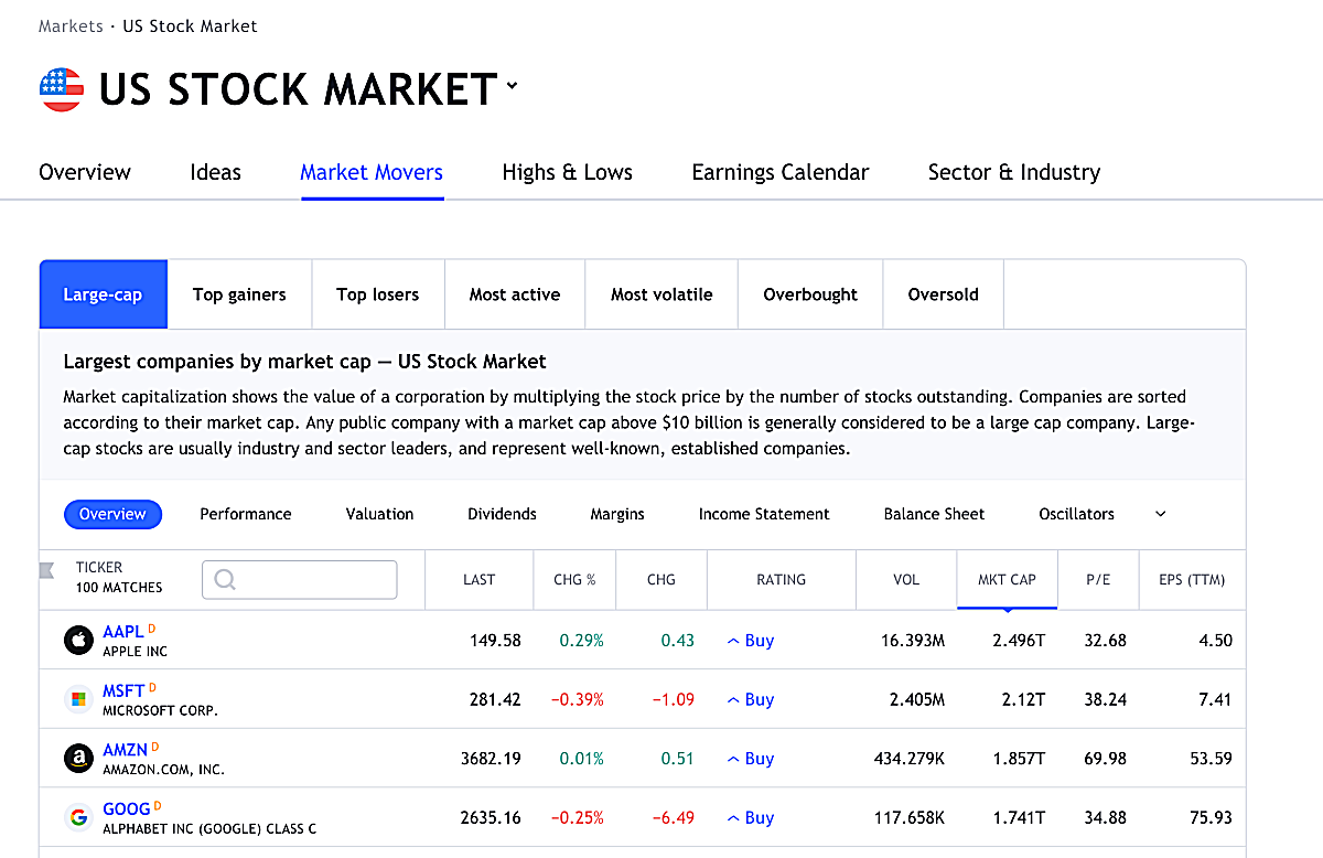시가총액 상위 기업을 확인하는 방법은 여러가지가 있다. 그 중에서 TradingView라는 사이트를 이용하면 손쉽게 시가총액 상위 기업들을 확인할 수 있다. 시가총액 외에도 수익, 손실, 거래가 많은 주식 등을 순서대로 확인할 수 있다.