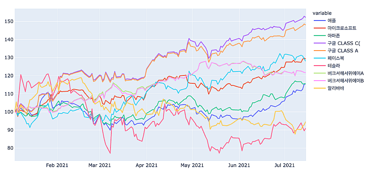 21년 1월3일의 주가를 100으로 놓고, 이후 개별 기업의 주가흐름을 비교해 보았다.