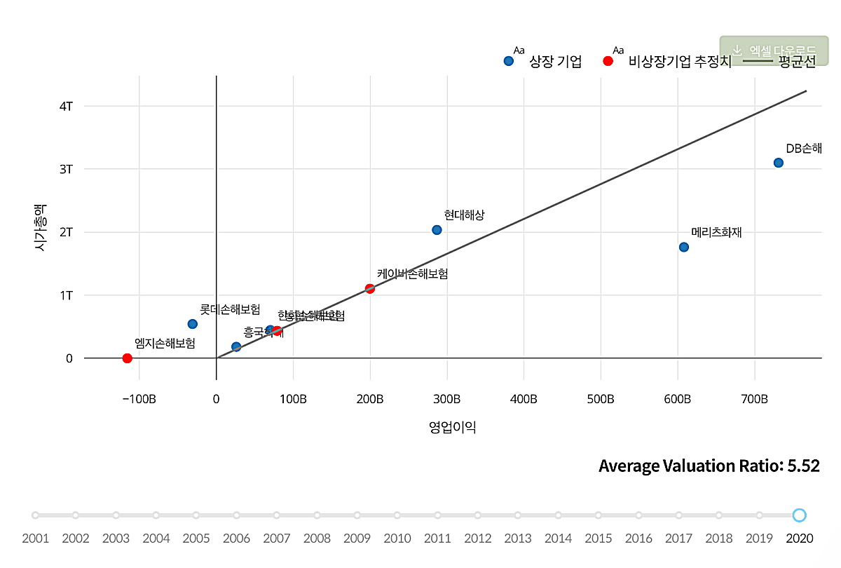 손해보험사의 시가총액과 당기순이익을 비교해보았다. 삼성화재가 대표성이 있기 때문인지, 당기순이익에 비해 시가총액이 높은 편이다.