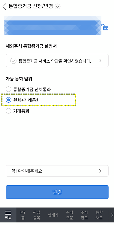 원화거래가 가능하도록 설정하기 위해서는 신한금융투자 앱에서 [고객센터] - [신청/변경] - [거래서비스] 메뉴로 이동한다. 상단에서 계좌번호를 고르고, '원화+거래통화'를 선택하면 원화 거래가 가능해진다.
