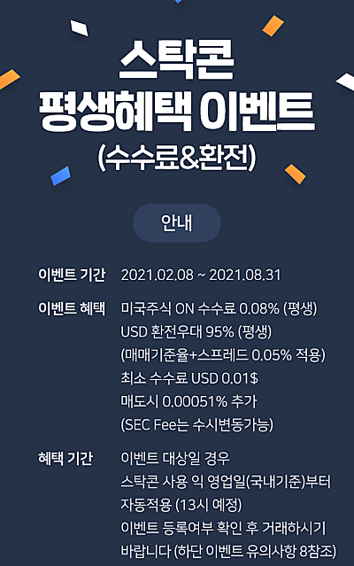 이벤트명은 '해외주식 선물하기 서비스 런칭'이다. 스탁콘 평생 이벤트로 매매수수료율 0.08%, 환전우대율 95%를 평생 제공하고 있다. 스탁콘을 이용할 때만 이 수수료율로 거래할 수 있다고 생각했는데, 확인결과 스탁콘 뿐만 아니라 해당 계좌에서 원화・외화 거래를 할 때도 모두 동일한 수수료율로 거래할 수 있다.