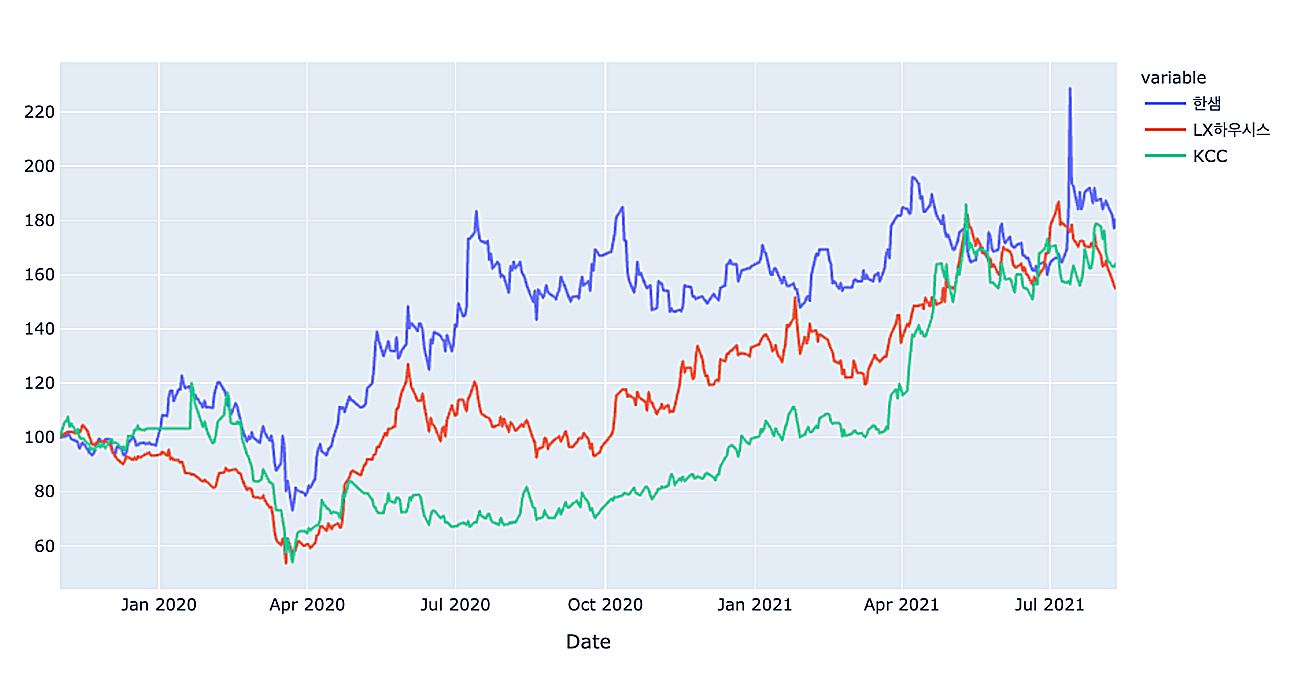 위 3기업의 주가를 비교해 보았다. 19년 11월 1일의 주가를 100으로 놓고 이후 흐름을 비교해보았다. 최근에 KCC가 많이 상승하면서 3기업의 주가 수준이 비슷하게 상승한 모습이다.