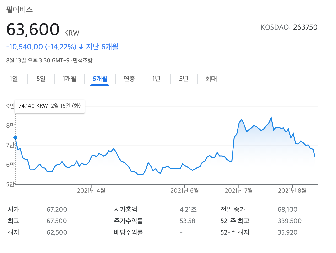 - PER: 56.99 (21년 3월 기준), 동일업종 PER 35.25