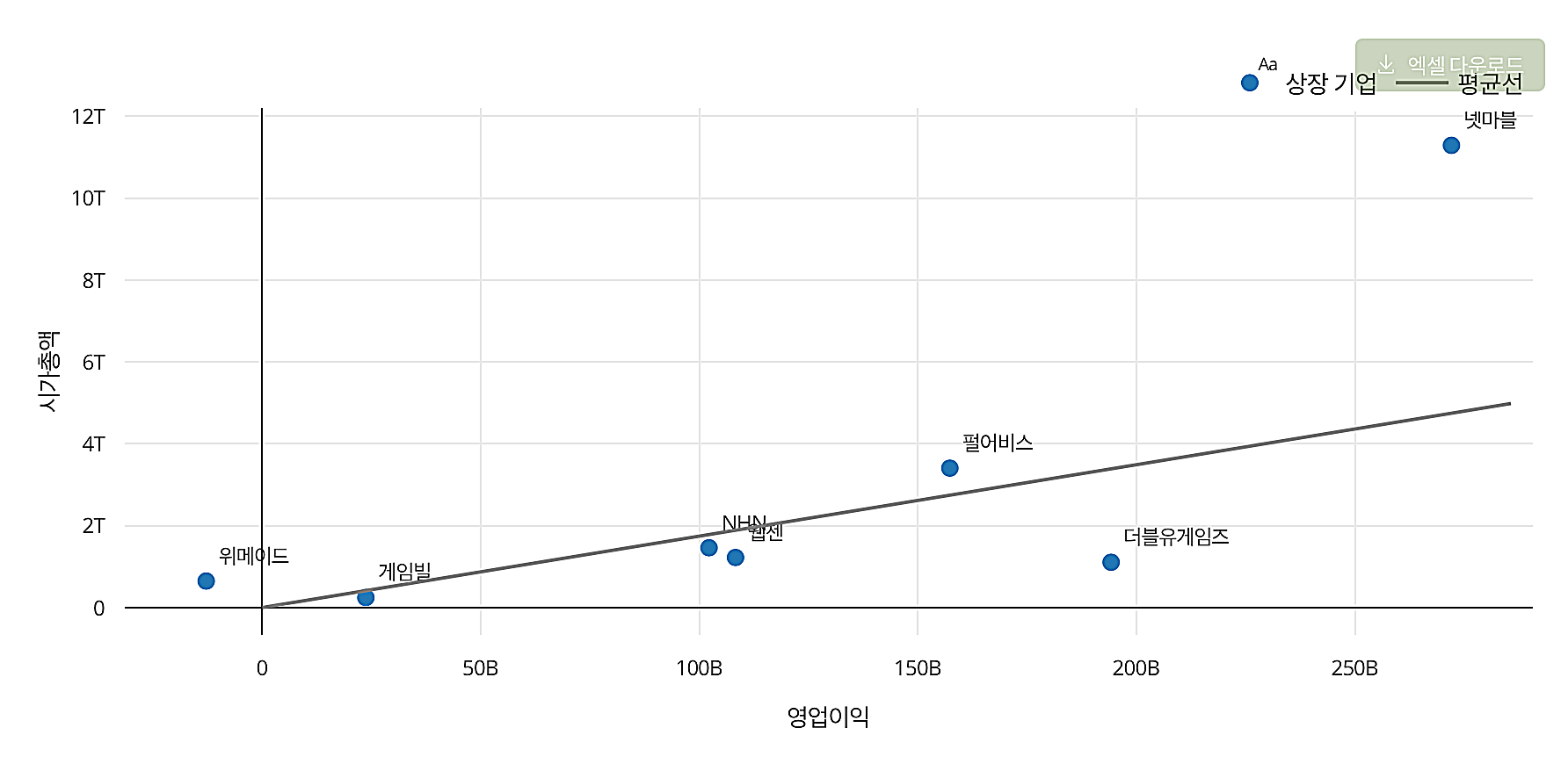 딥서치를 이용해서 다른 게임회사의 영업이익과 시가총액을 비교해 보았다.