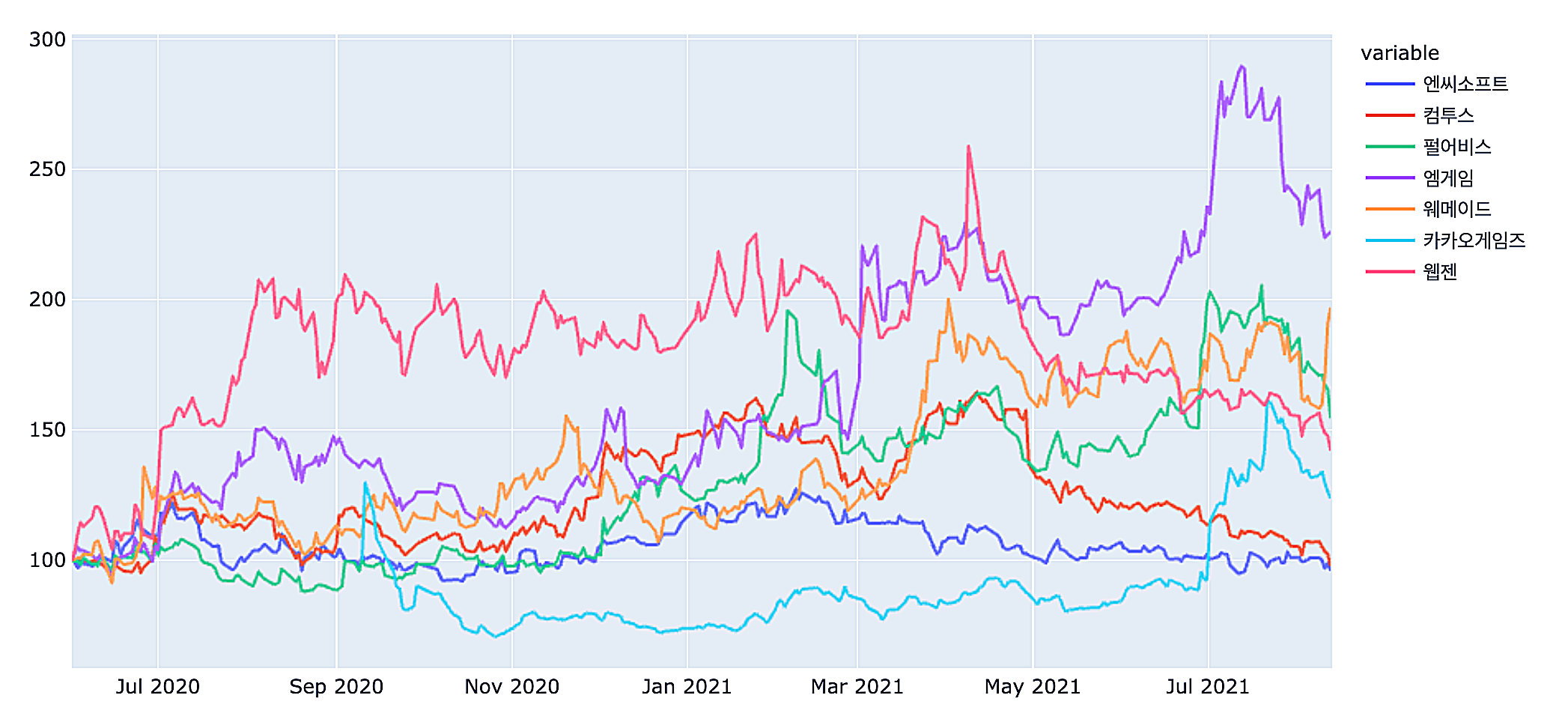 최근에 펄어비스 외에도 대부분의 게임주가 주가가 하락했다. 중국발 규제 리스크와 2분기 어닝쇼크를 그 원인으로 보고 있다. 필자가 관심 있는 게임주 기업들의 주가를 비교해 보았다. 20년 6월 1일의 주가를 100으로 놓고, 이후 흐름을 비교해 보았다.