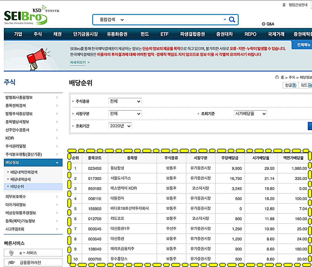 증권정보포털 SEIBro를 이용하면 국내주식 중에서 배당금 높은 주식을 확인할 수 있다. [주식]-[배당정보]-[배당순위]에 가면, 시가배당율을 기준으로 높은 주식을 알 수 있다.