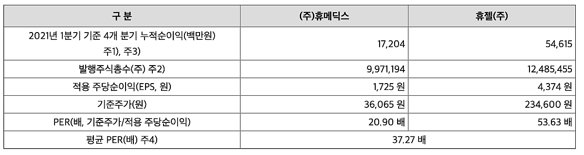 유사기업으로 분류된 휴메딕스와 휴젤의 평균 PER은 아래와 같다.
