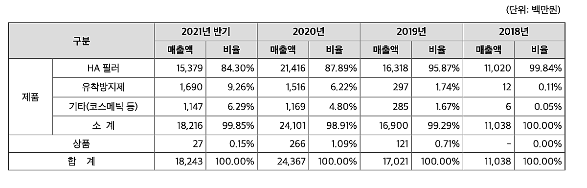 IPO를 통해서 확보한 자금은 관절조직수복재와 방광염치료제 판매, 생체유방, 생체연골대체제 등 다양한 의료기기에 대한 연구, 중국 내 필러・유착방지제 등의 직접 생산 등에 사용될 것이라고 한다. 현재 매출구조는 필러에 대한 의존도가 상당히 높다.