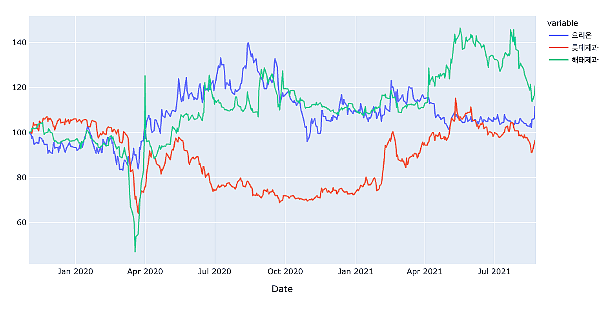 제과류 기업 3곳의 주가를 비교해 보았다. 19년 11월 1일의 주가를 100으로 놓고 이후, 흐름을 비교해보았다.