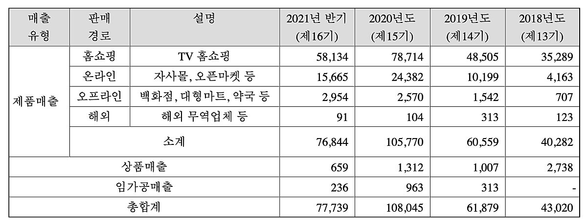 주요 판매채널은 홈쇼핑으로 판매경로별 매출액은 아래와 같다. 21년 반기를 기준으로 홈쇼핑의 매출비중이 약 75.6%이다. 홈쇼핑이 높은 매출 비중을 차지하는 것은 조금 아쉽다. TV시청시간이 점차 줄어들면서 홈쇼핑의 영향력도 작아질 것으로 예상되기 때문이다. 하지만, 건강식품의 특성상 홈쇼핑 채널과 잘 맞는다는 생각도 해보게 된다.
