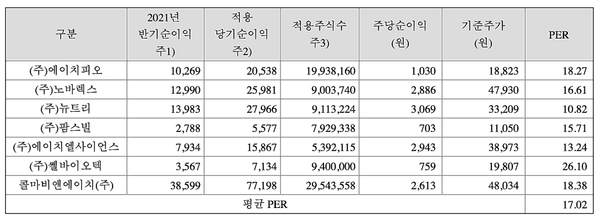 유사기업으로 선정된 기업은 에이치피오, 노바렉스, 뉴트리, 팜스빌, 에이치엘사이언스, 쎌바이오텍, 콜마비앤에이치의 7개 기업이다. 평균 PER은 17.02이다.