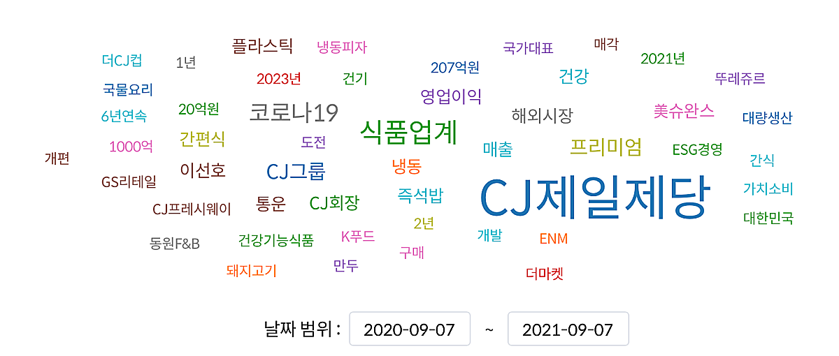 딥서치에는 뉴스를 키워드 단위로 분리해서 보여주는 '인공지능 뉴스분석' 서비스도 제공하고 있다. 눈에 띄는 키워드를 살펴보면, '美슈완스'가 있다. CJ제일제당은 美슈완스를 인수해서 2년 동안 미국 매출액이 10배 증가하였다고 한다. 그 외에도 식품 관련된 키워드들을 많이 확인할 수 있다.